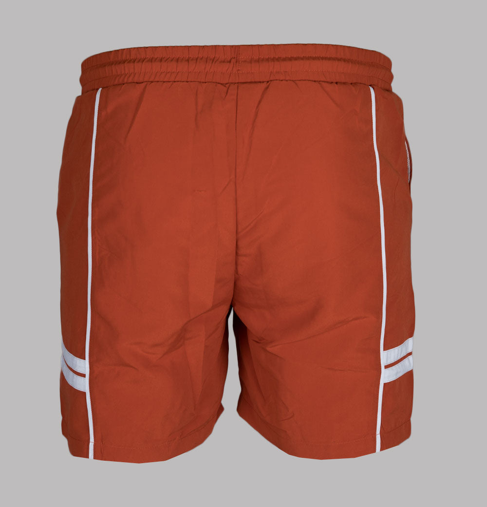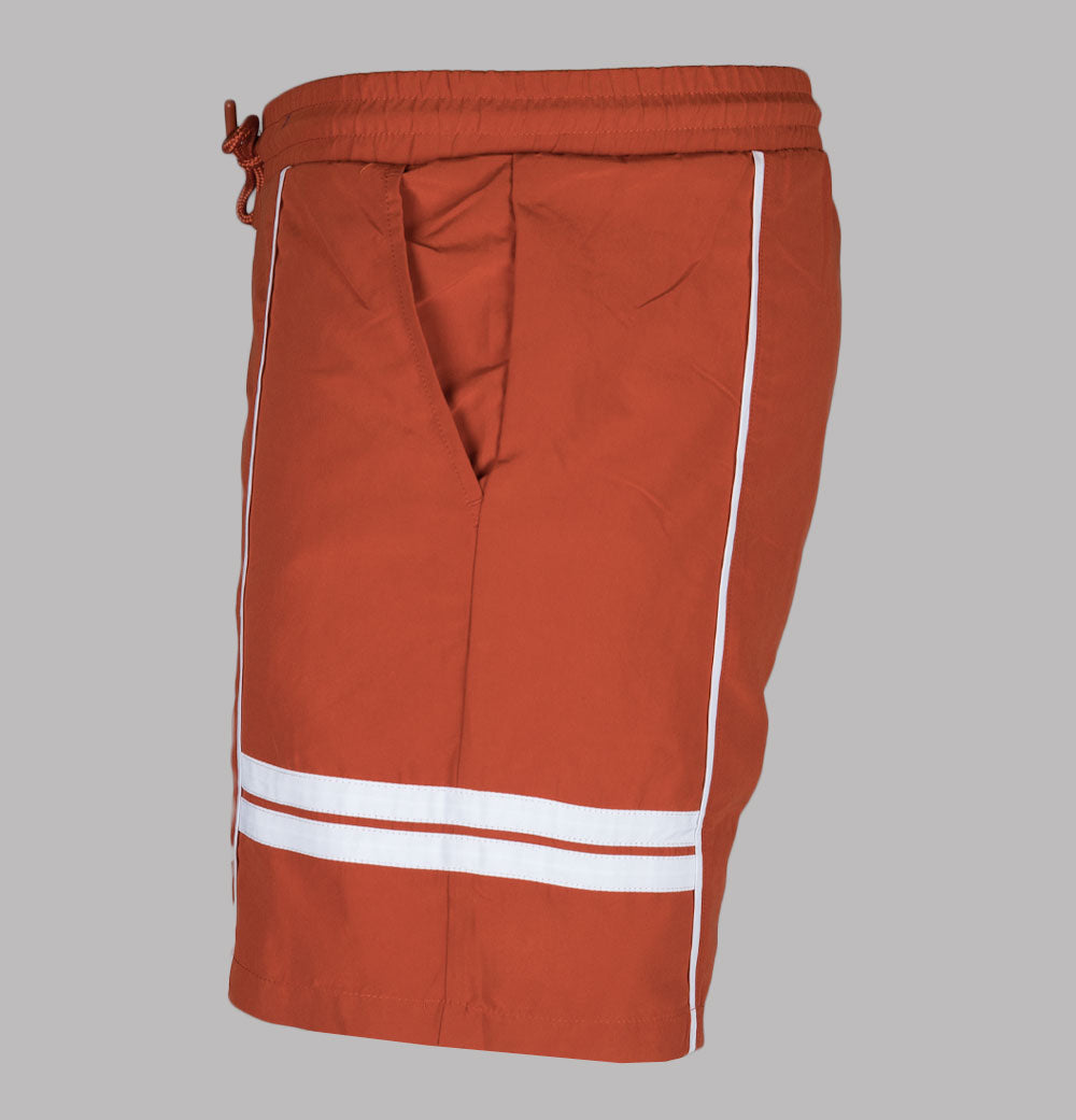 Sergio Tacchini Romolo swim shorts in Rooibos Tea/Gardenia. Lightweight polyester fabric. Elasticated waistband with adjustable draw cord. Front pockets. Panel detail on the legs. Embroidered Sergio Tacchini logo. Mesh lining. Slim fit. 100% polyester.