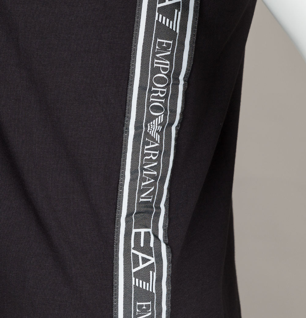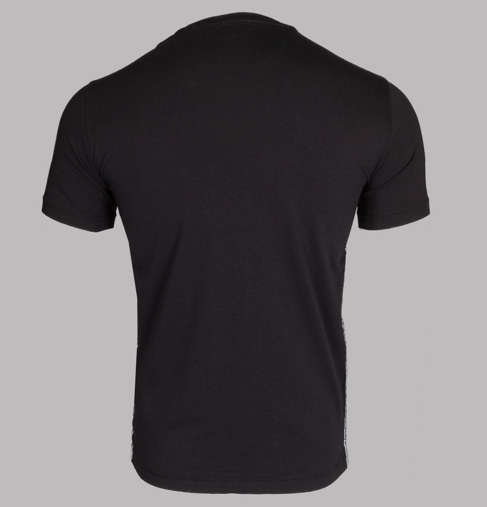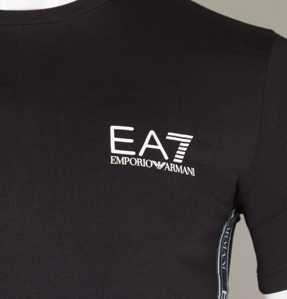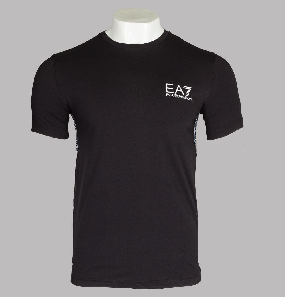 EA7 Emporio Armani short sleeve side taping logo t-shirt. Black stretch cotton jersey fabric. Finely ribbed crew neck. White EA7 Emporio Armani logo print on the chest. EA7 Emporio Armani branded taping on the sides. Regular fit with a nice stretch in the fabric. Straight hem. 95% cotton, 5% elastane.