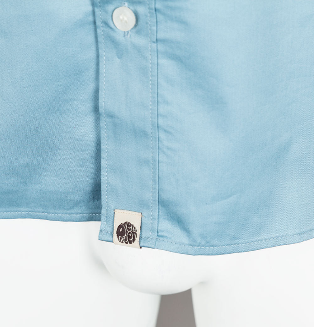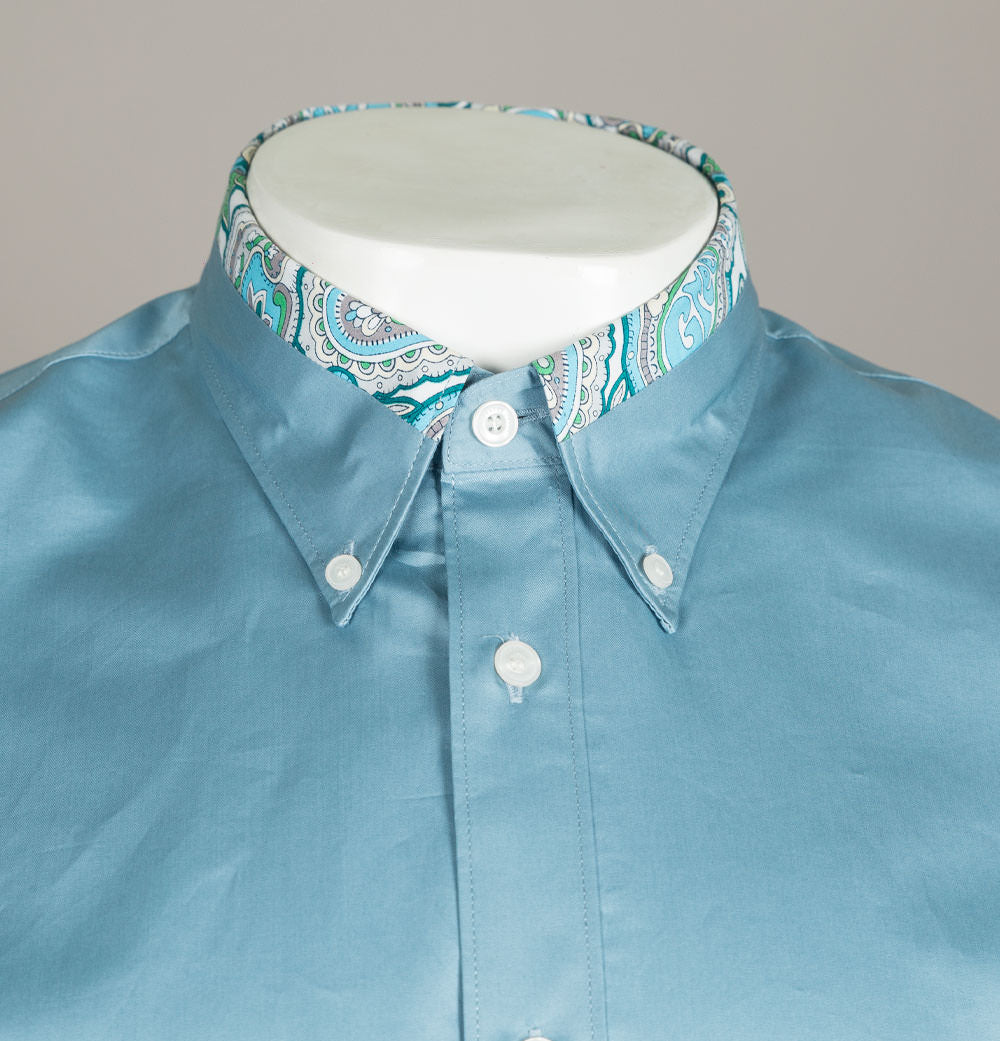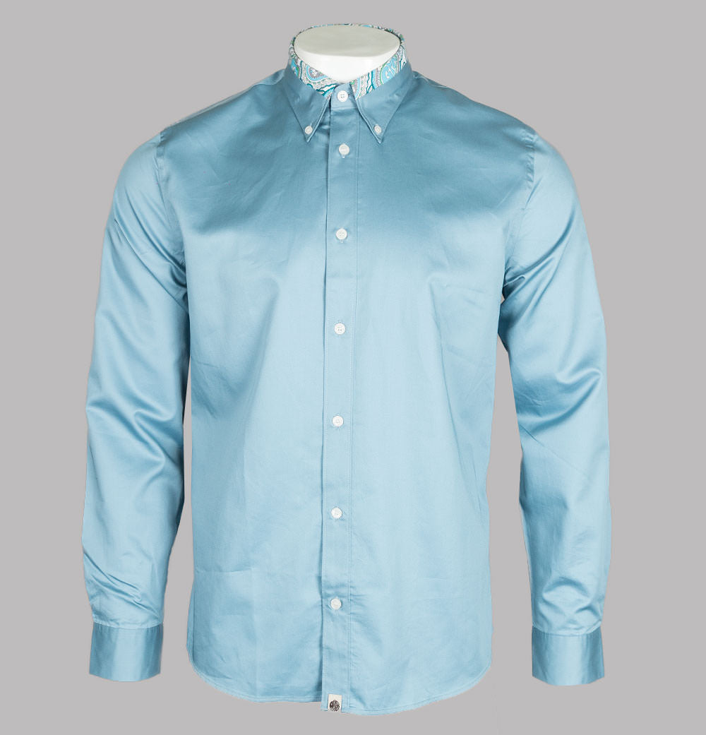 Pretty Green long sleeve Paisley print collar shirt. Blue pure cotton fabric. Classic button down collar with Paisley trim detail. Single button sleeve cuffs. Signature Pretty Green tag on the hem. Vintage Paisley tag on the back of the neckline. Pretty Green branded buttons. Cut in a slim fit with a curved hem finish. 100% cotton.