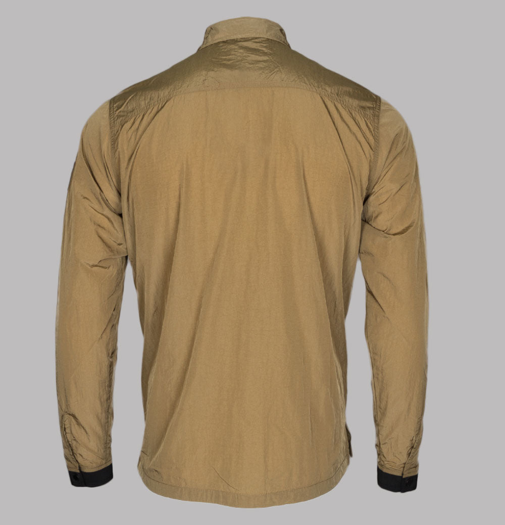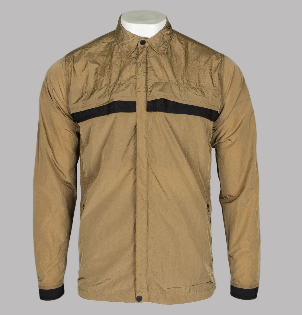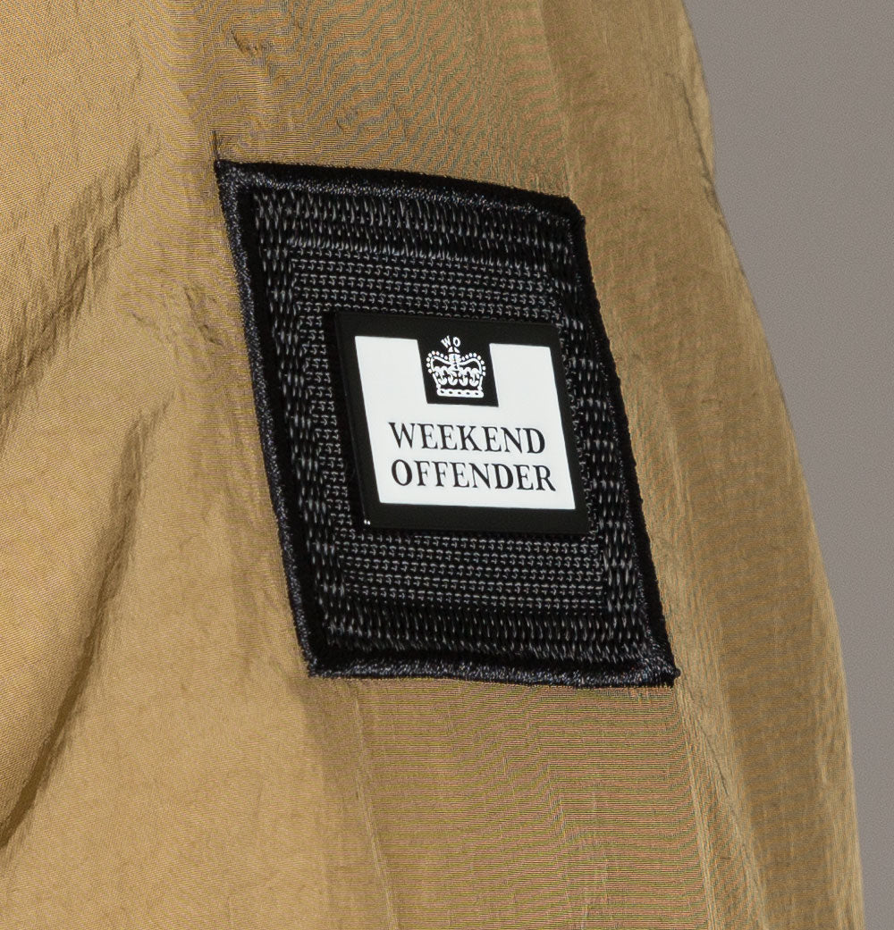 Weekend Offender Gaethje overshirt. Ginger lightweight nylon parachute fabric with a water repellent coating. Concealed full front zip up fastening with a Weekend Offender branded zipper. Pointed collar with a press stud button. Dual front chest pockets with Weekend Offender branded jacquard tape. Two lower zip pockets. Embroidered Weekend Offender badge on the left sleeve. Elasticated sleeve cuffs. Two large inside pockets. Comes with a matching face mask. Regular fit. 100% nylon.