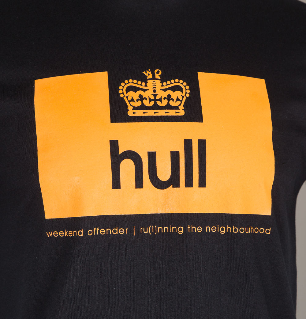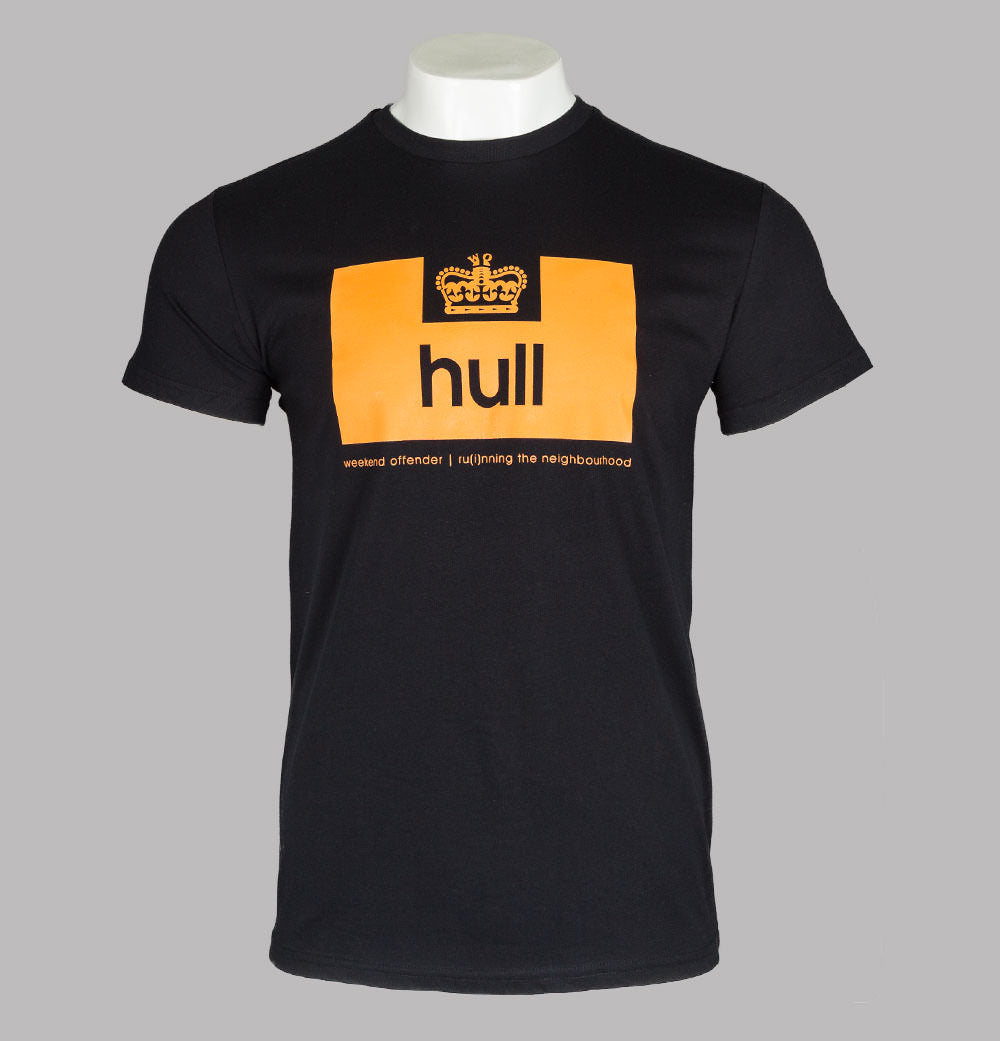Weekend Offender Hull edition T-Shirt. Black premium cotton jersey fabric. Limited edition Hull print on the chest in Orange. Small embroidered 'Admit Nothing' tag on the seam. Ribbed crew neck. Regular fit. 100% cotton.
