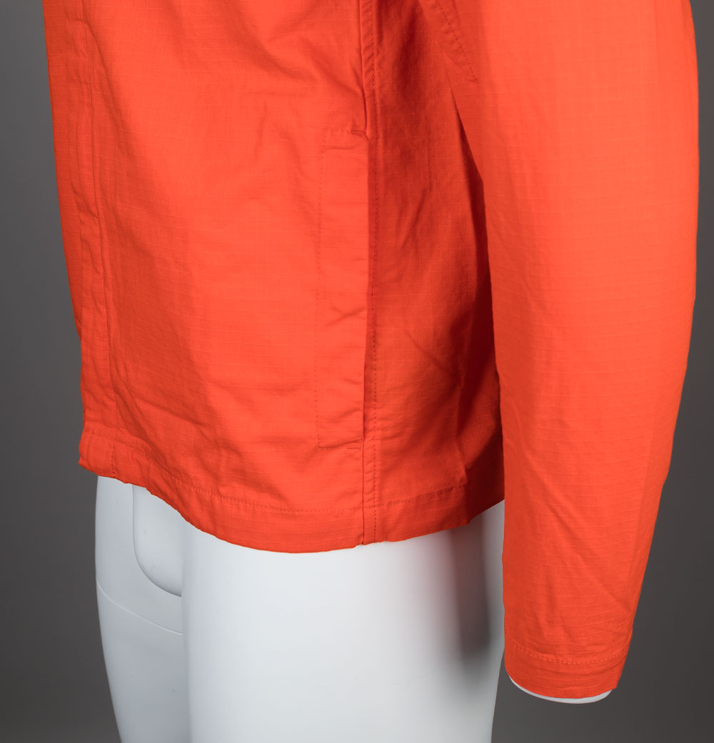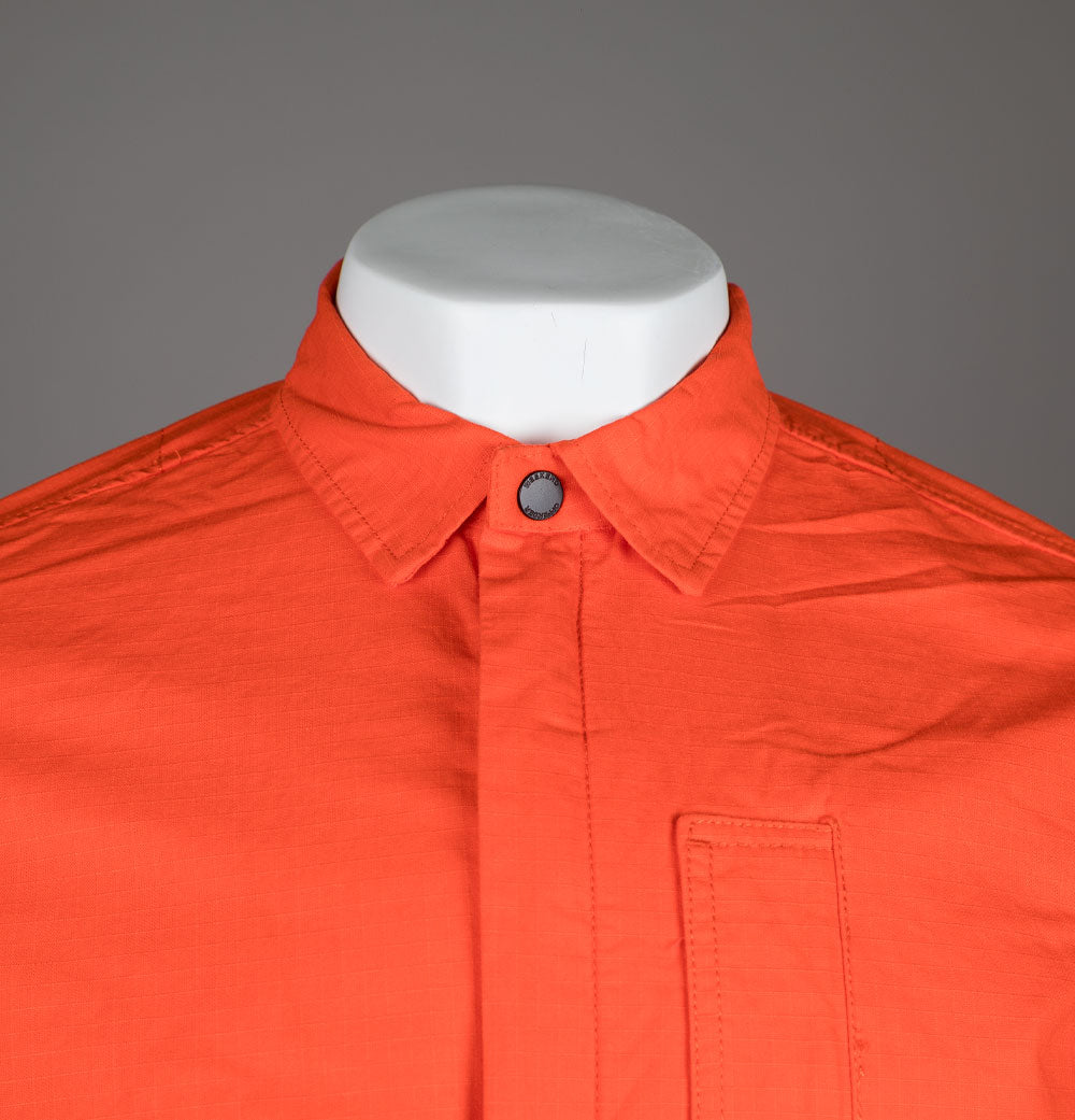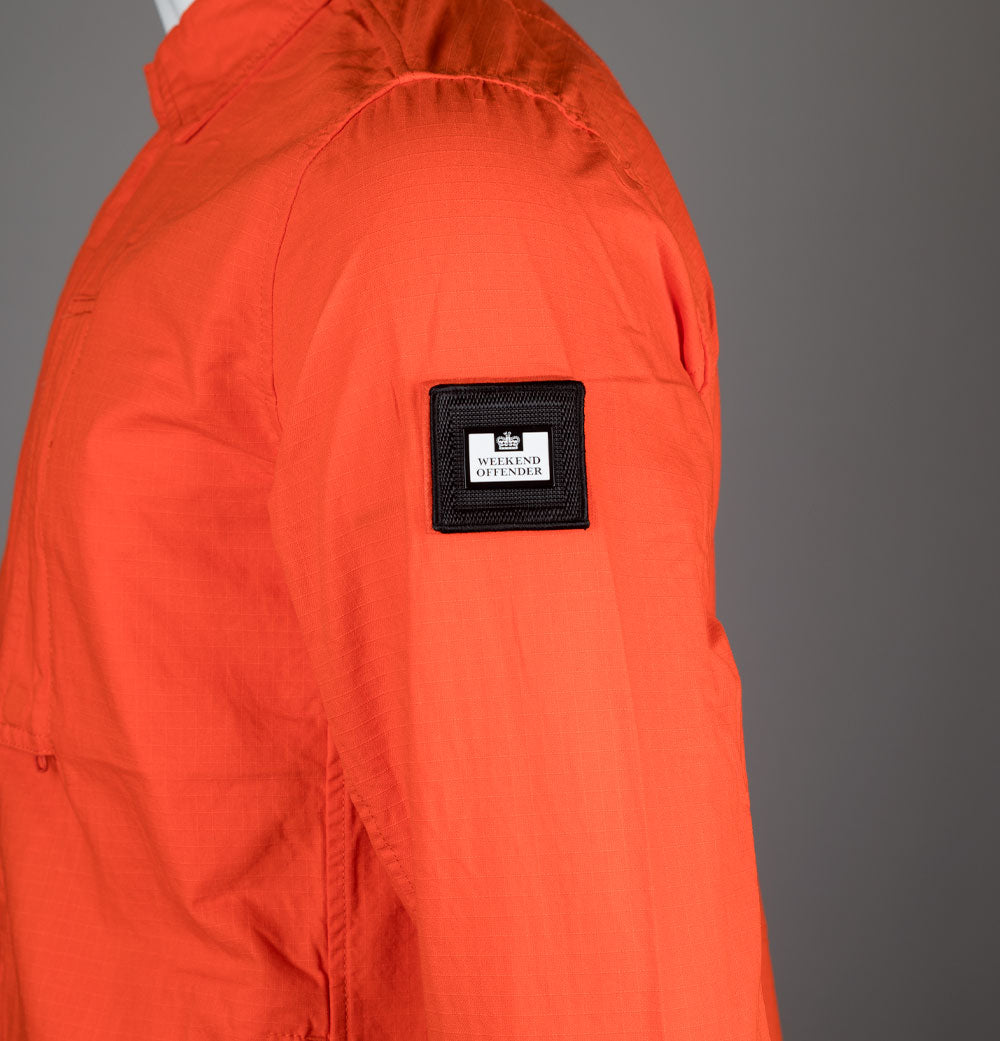 Weekend Offender Porter overshirt. Pure Orange cotton ripstop fabric. Concealed front zip up fastening with a top and bottom press stud. Pointed collar. Concealed zip pocket on the chest. Side entry press stud pockets. Removable velcro Weekend Offender badge on the sleeve. Button sleeve cuffs. Regular fit. 100% cotton.